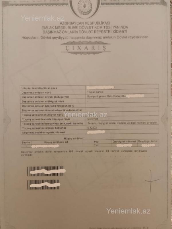 Sumqayıt ş. Bakı-Quba yolunda, Sumqayıtın çıxış hissəsinə yaxın yerdə 12.5 sotda boş torpaq sahəsi satılır.Sənaye təyinatlı torpaq sahəsidir.Sahə əla ölçüdə olmaqla,magistral yolun kənarında (1-ci sırada) yerləşir.Sənədləri tam qaydasındadır.Çıxarışı və texniki pasportu var.Yanacaq doldurma məntəqəsi,nəqliyyat sahəsinə aid olan istənilən formada obyekt tikmək mümkündür.Xahiş olunur ciddi şəxslər müraciət etsinlər.