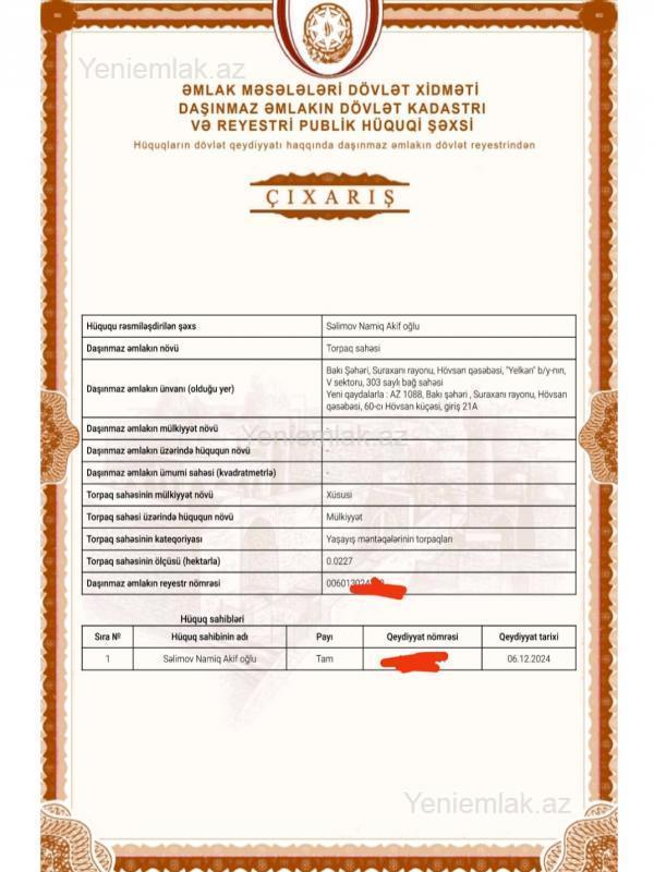 Hovsan qes levengi adlanan erazide yerlewen 2.5 sotda torpag sehasi satilir