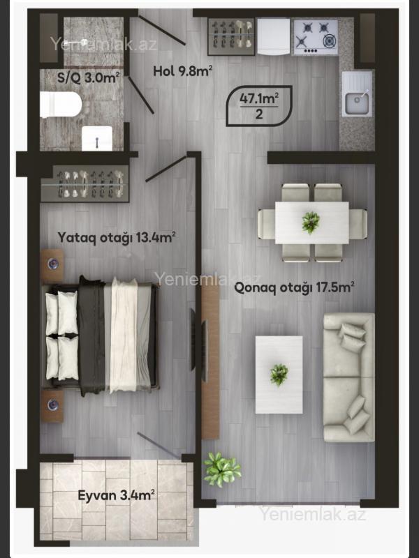 2 otaq 47.1 m2 20 / 10 Mərtəbə Kupça