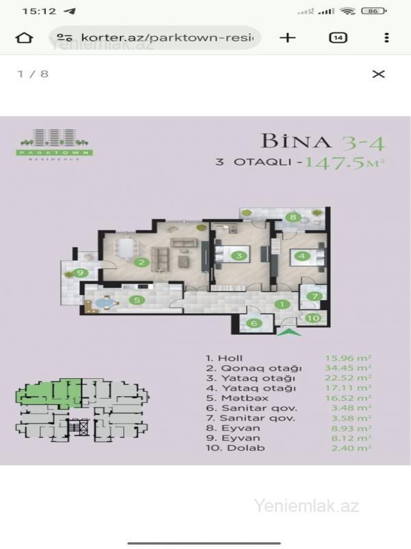 Yasamal rayonu, Dövlət Statistika komitəsinin yaxınlığı, yeni tikilən kompleks, ümumi sahəsi 147.5 kv.m. olan, geniş və dəniz mənzərəli qanuni 3 otaq, ara divarları istəyə görə bölünə bilər. Bütün sayğaclar ödənilib. Binada yaşayış var. Qapalı və mühafizəli həyət. Bir başa parkinqa lift işləyir. Sənəd müqavilə, yaxın zamanlarda çıxarış veriləcək. -1ci mertebede qarajda var. Duz liftin yaninda 1 maşınliq yerdə satılır (əlavə ödəniş olunacag, yani elanda qeyd olunan qiymətə qaraj daxil deyil)