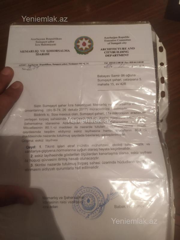 Sumqayıt şəhəri 11 mikrorayonan üz bə üz qarajlarin yani 6 sotda 2 mərtəbəli həyət evi satılır. 12metr 10,40 metriyə tikilib. Qoşa daş ilə tikilib. Hündürlük 3.20metr. birinci mərtəbə bəzi işlər qalıb. 1 mertebe böyük Zal kuxna hamam tualet ayrı, 2 mertebe 3 otaq bir böyük spalni, Spalninin içinde balaca qardirob kimi otaq, Orda torpagın sotu 15 20 min arasıdı. Ara kesme monoltdir. Alıcı tərəfindən Xidmət haqqı 2 faiz