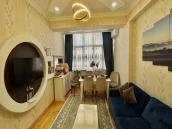 Kirayə verilir 3 otaqlı tam mebelli mənzil zal və mətbəx studiya tipində yumşaq künc divan əlavə kreslo divar tv kondisioner yemək masası və stullar mət...
