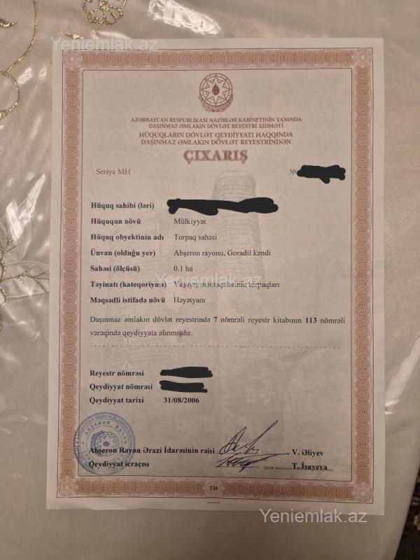 Abşeron rayonu, Goradil kəndində yerləşən 10 sot paket kupçalı torpaq sahəsi satışa çıxarılıb. Torpaq sahəsi yaşayış üçün əlverişli ərazidə yerləşir. Ətrafında yaşayış var, qaz, su, işıq xətləri mövcuddur. Sənədləri tam qaydasındadır, paket kupça (torpaq və tikili üçün çıxarış almaq mümkündür). Rahat yerləşməsi ilə seçilən bu sahə həm fərdi yaşayış evi tikmək, həm də investisiya məqsədilə almaq üçün uyğun variantdır. Real alıcı ilə qiymətdə razılaşma olacaq