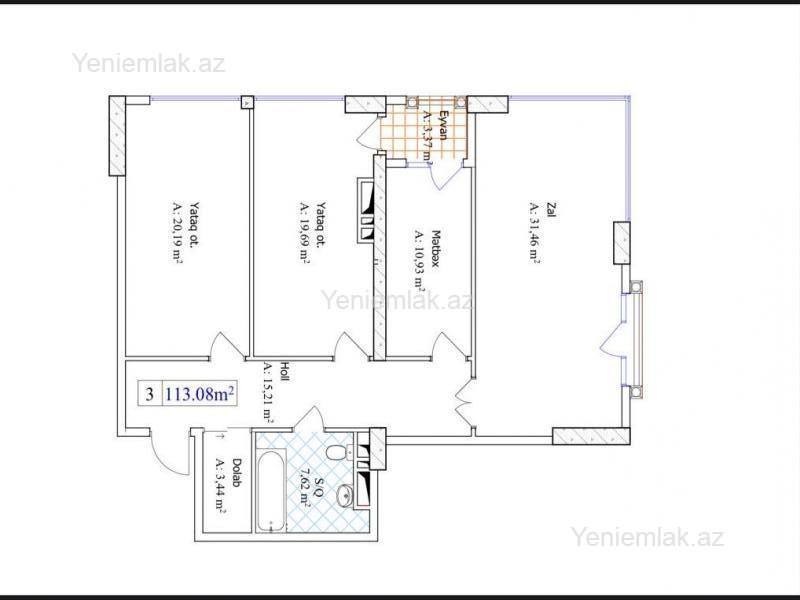 3 otaq 113 m2 18 / 12 Mərtəbə Kupçasız