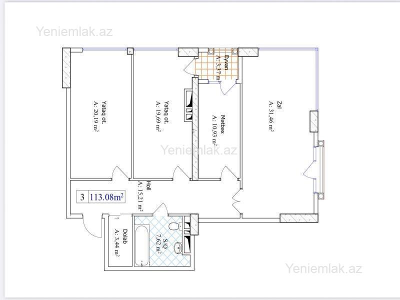 3 otaq 113 m2 18 / 16 Mərtəbə Kupçasız