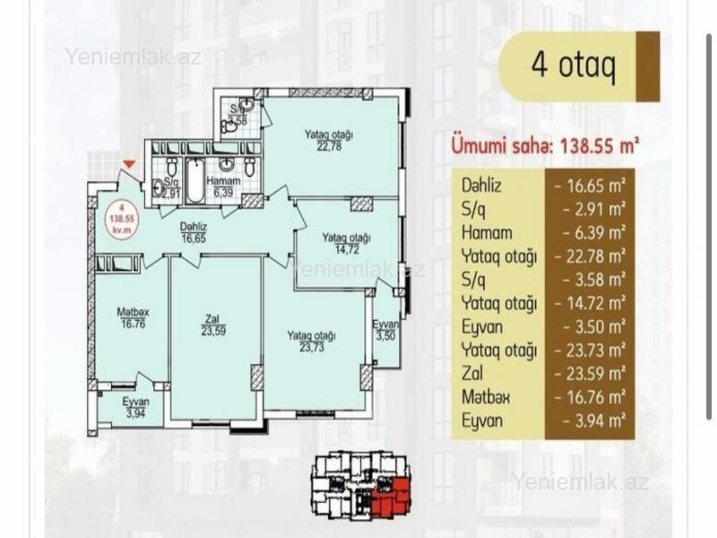 Bakı şəhəri Binəqədi rayonu,Azadliq metrostansiyasın yaxınlığında yerləşən, yeni inşa edilmiş 14 mərtəbəli binanın 6-ci mərtəbəsində 4 otaqli,Təmirsiz 139 kv.m sahəsi olan mənzil satılır. Mənzildə su,işıq,qaz daimi fasiləsiz verilir. Binanın geniş həyəti, uşaq əyləncə parkı,2 mərtəbə yeralti avtomobil dayanacağı, 24 saat mühafizəsi, bloklarında kodlu seyf qapıları siz alıcıların ixtiyarına verilir. Bina super marketlərə, ticarət mərkəzlərinə, uşaq baxçalarına, orta məktəblərə yaxın ərazidə inşa edilib. Mənzil haqqında ətraflı məlumat almaq istəyənlər aşağıdakı telefon nömrələri ilə əlaqə saxlaya bilərlər.