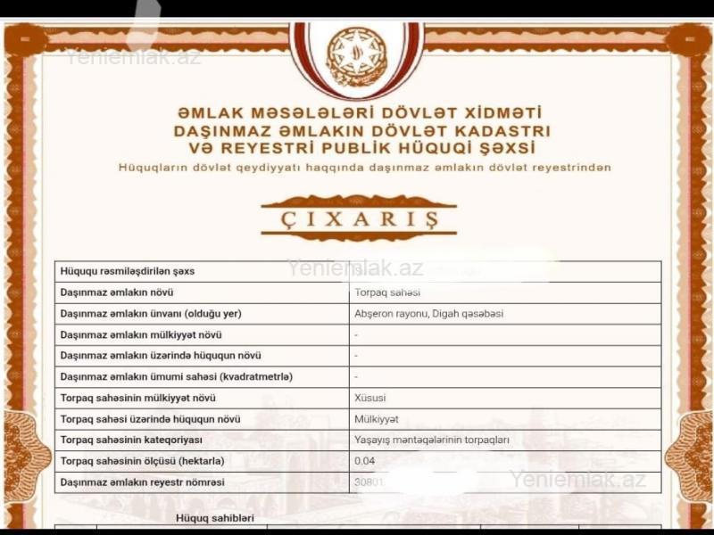 Abşeron rayonu, Digah qəsəbəsi, əsas yoldan 300 metr içəridə 4 sot torpaq satılır. Qaz, su, işıq xətləri mövcuddur. Yaxınlıqda məktəb və baxça var. Avtobus dayanacağına 5 dəqiqəlik məsafədədir. Sənədi Çıxarışdır (kupça). Ciddi alıcıya yerində endirim olunacaq. Əlavə məlumat və digər əmlaklar üçün müraciət edə bilərsiniz.
